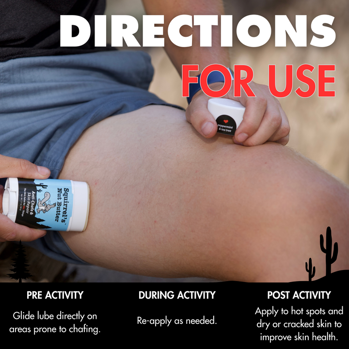 1) Pre-Activity: To prevent chafing and blisters, apply directly to any skin prone to chafing or blisters, including underarms, thighs, crotch, nipples, and feet, or under your bra or pack straps.